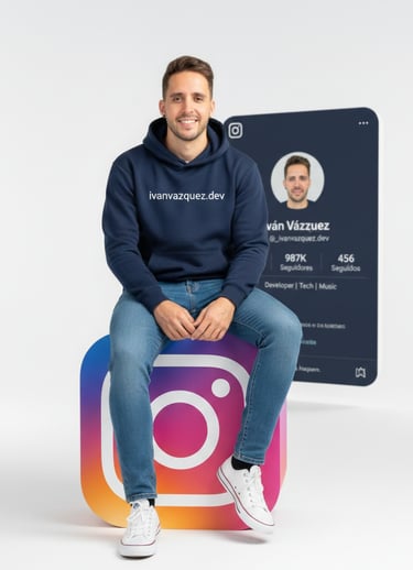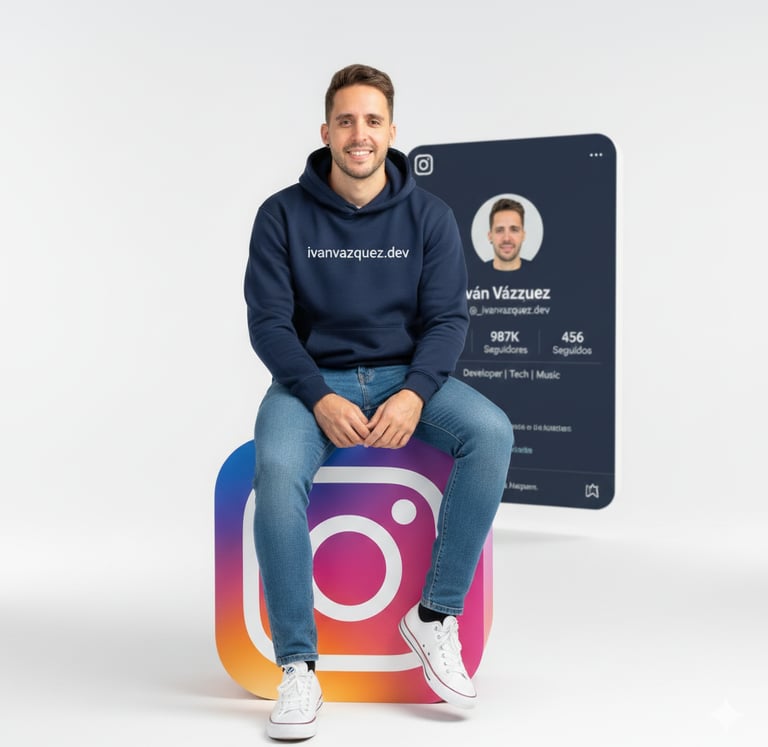 "Create a hyper-realistic image in vertical format 9:16. Show a young [MAN OR WOMAN] with the appearance of [your face or physical description] and wearing. He is sitting in a relaxed way on a large 3D logo of Instagram in vibrant colours. Wear modern urban clothing: Coloured hoodie [sweatpants colour] with the '[YOUR WEB]' logo, jogger pants [pants colour] and sneakers [shoe colour]. In the background, a large profile card of [social network] identical to a real profile appears, with realistic details: name '[REAL NAME]; user '@[USERNAME], [number of followers] Followers, [number of following] following and [Other data]. The background should be clear, minimalist style, soft lighting, professional, fresh and youthful look, ideal as a social network cover."