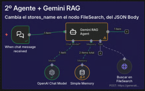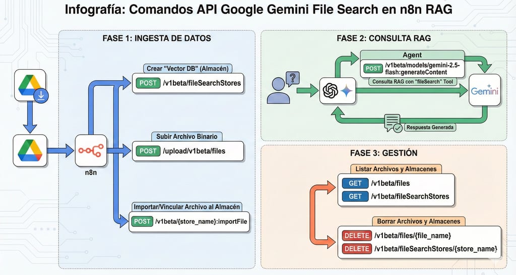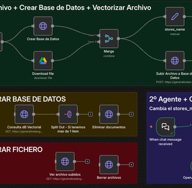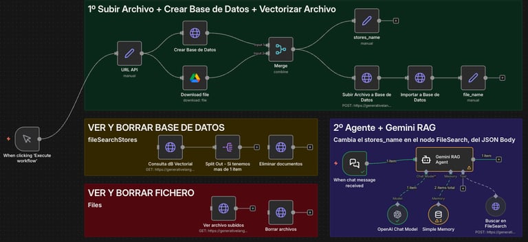 Gestión de Archivos: El workflow incluye nodos para Listar y Borrar archivos/stores, permitiéndote limpiar la base de datos y no acumular costes de almacenamiento en la nube de Google.
