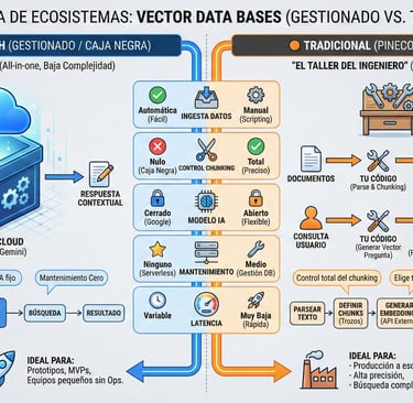 A diferencia de los sistemas tradicionales donde necesitas una base de datos vectorial externa (como Pinecone, Qdrant, Supabase ..), aquí Google se encarga de vectorizar, almacenar y recuperar la información por nosotros.
