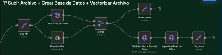 Nota clave: El nodo Merge es vital aquí. Espera a que tengamos tanto el ID del Store creado como el Archivo descargado antes de proceder a la importación.